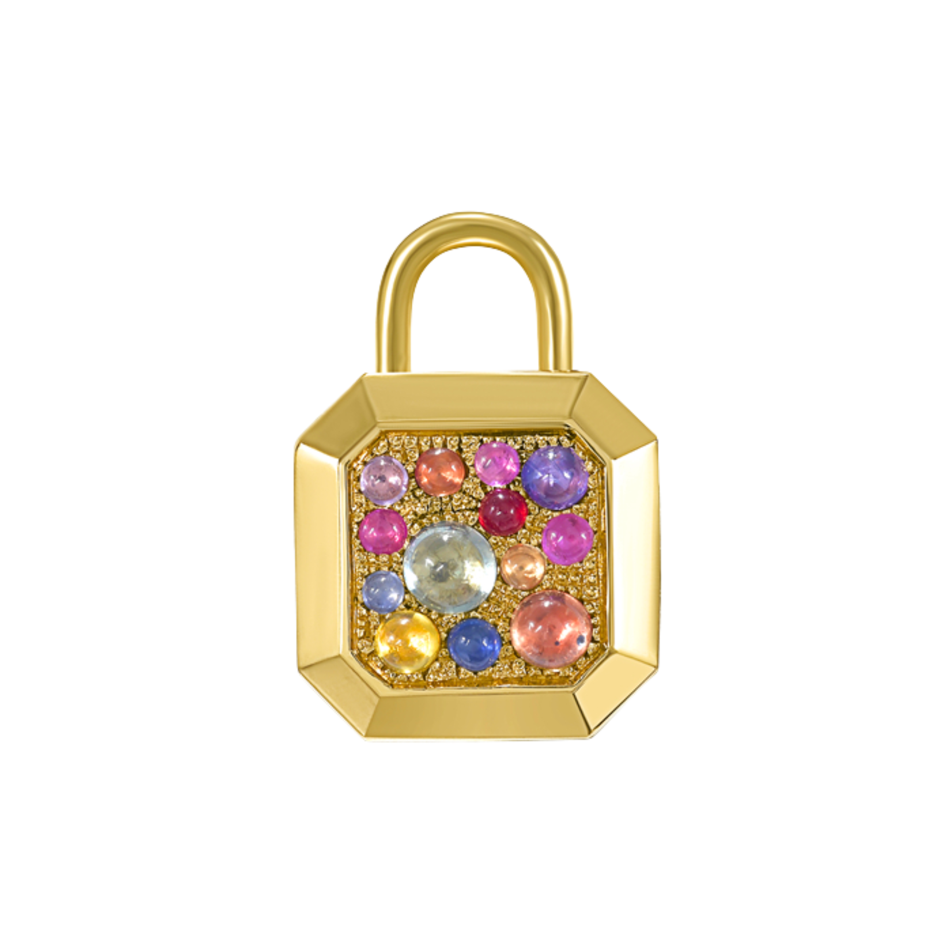 This pendant takes inspiration from the humble padlock, a symbol of protection, security,  commitment and connection. This one of a kind sapphire cabochon detail pendant has a secret ! It has a hidden door at the back, concealing a small locket chamber which can be used as a space to engrave words from a loved one, or hold something precious. The padlock mechanism is spring loaded and can be used to connect chains together or attach to your other pieces.  Open ended barley chain sold separately.