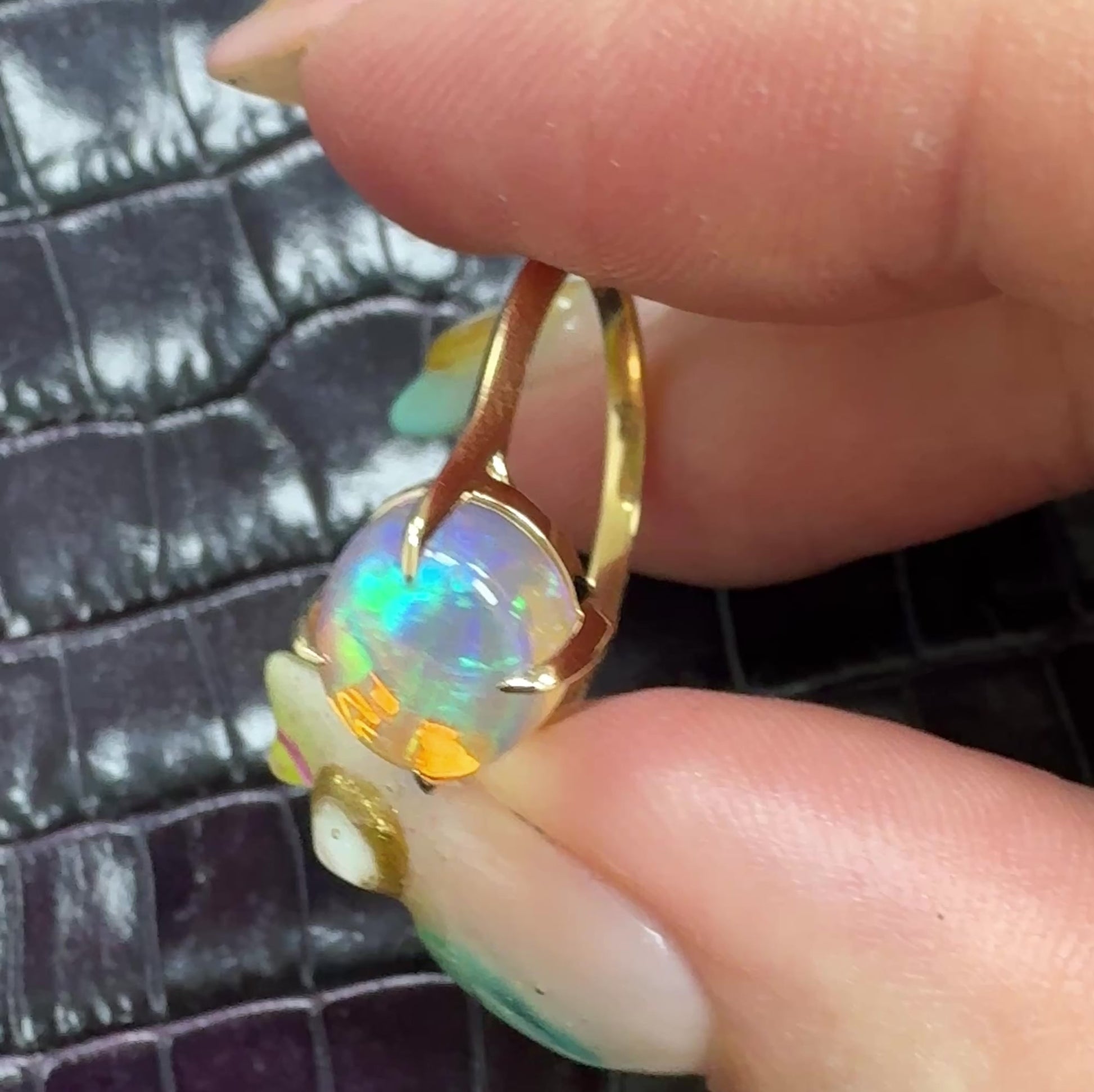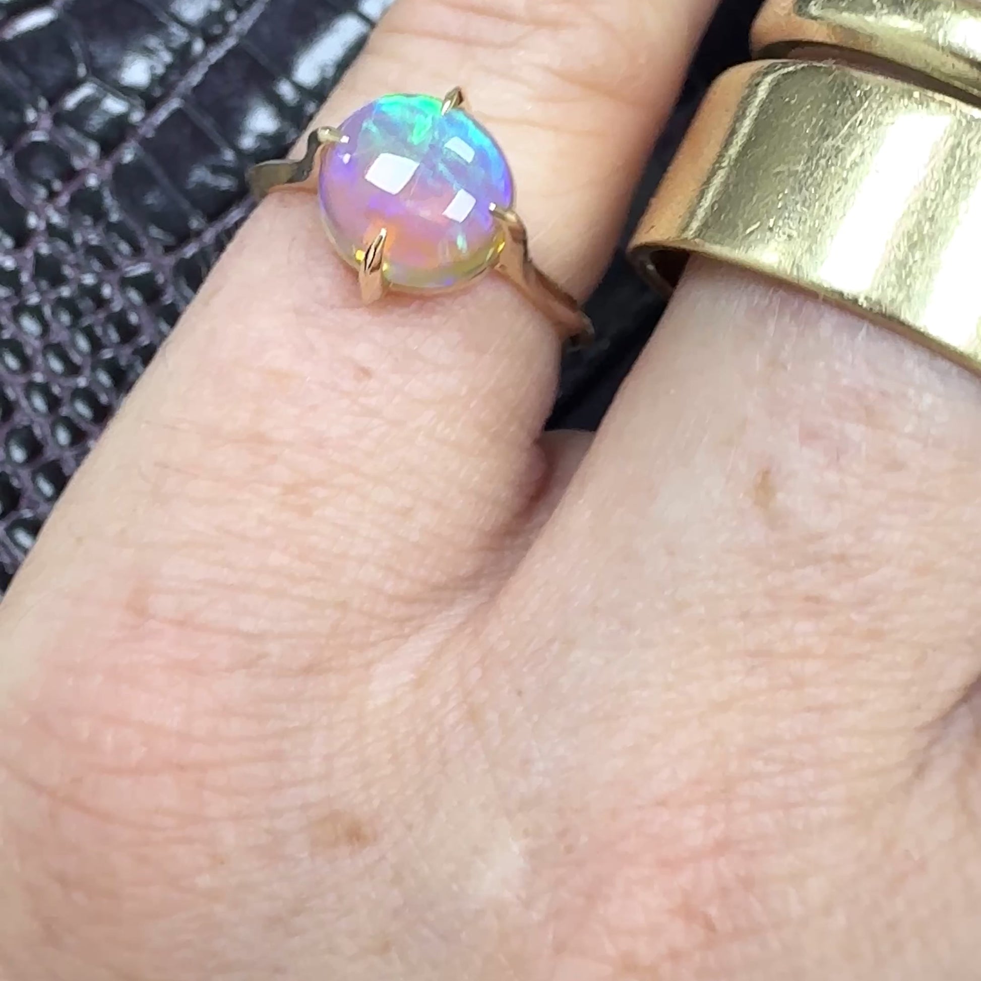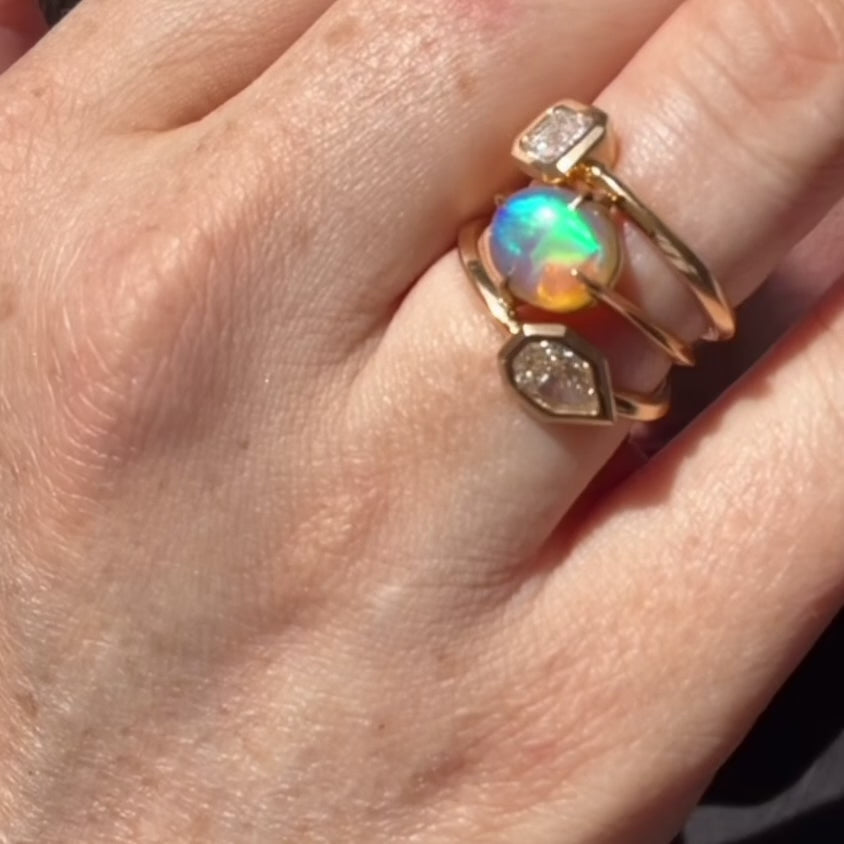 This one of a kind Australian crystal opal from Lightning Ridge, is set in to our signature compass setting, which allows this dramatic gemstone, with its internal play of color to take center stage. Opals symbolize hope, creativity and transformation, making this compass ring the perfect choice for those seeking to embrace positive change and ignite their inner fire.